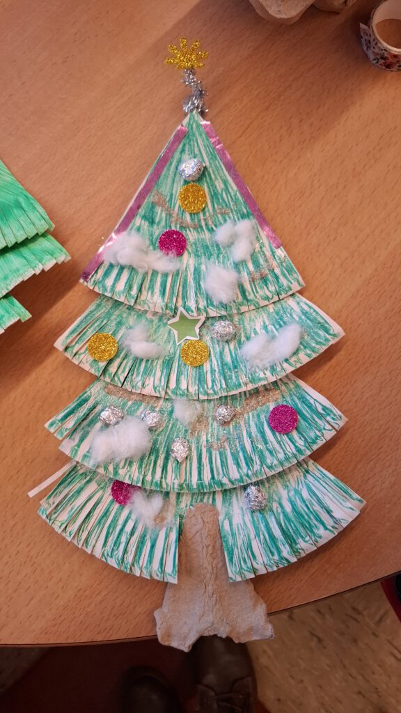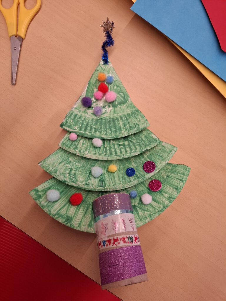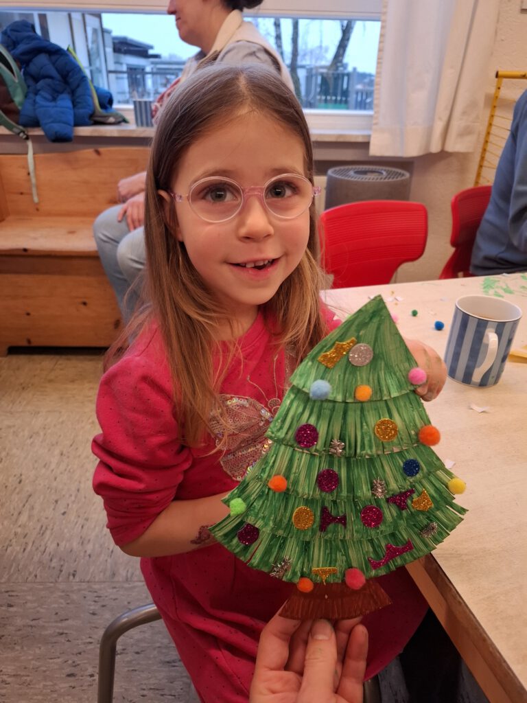 Diesmal stand alles unter dem Motto „Advent und Weihnachtszeit“. Dazu wurden aus Pappteller schöne Weihnachtsbäume gebastelt und bemalt und anschließend von den kleinen Künstlern geschmückt.