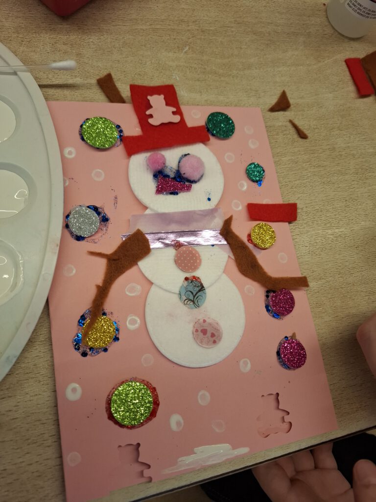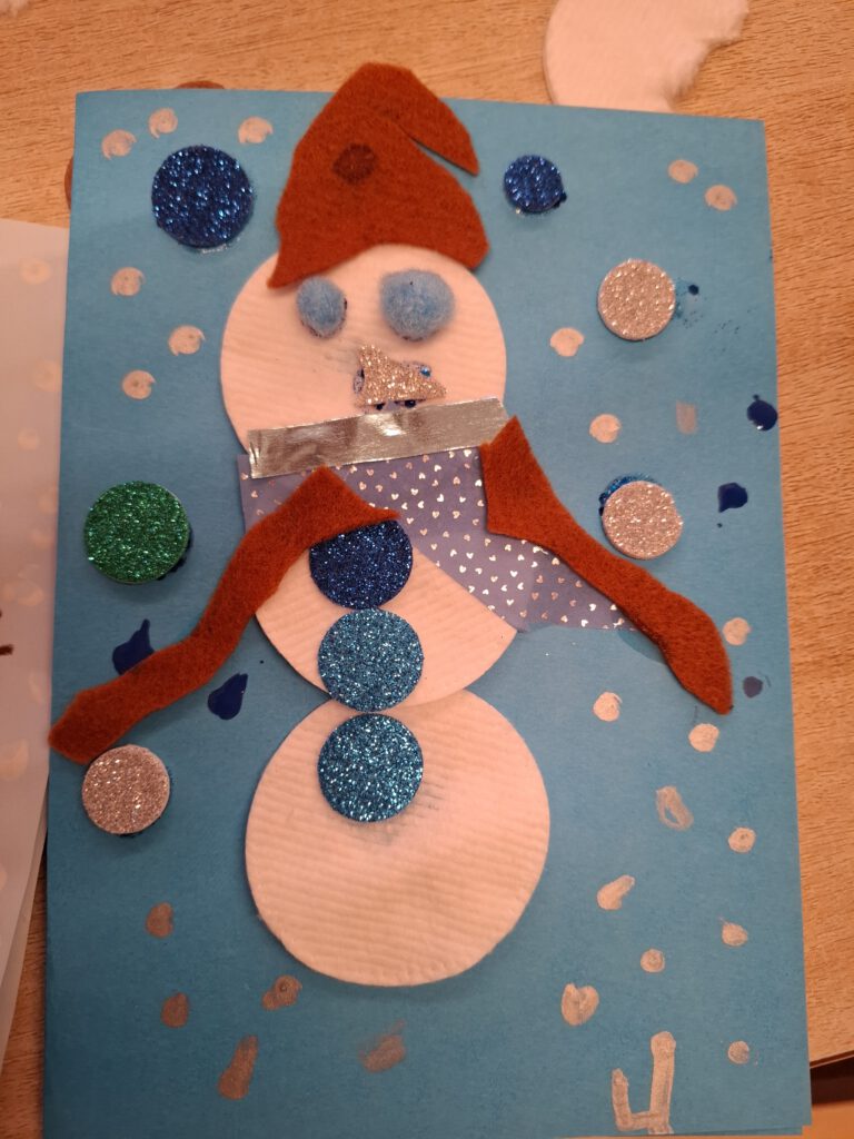 Das zweite Projekt war eine Weihnachtskarte mit einem Wattepad-Schneemann, der von jedem Kind individuell gestaltet wurde.